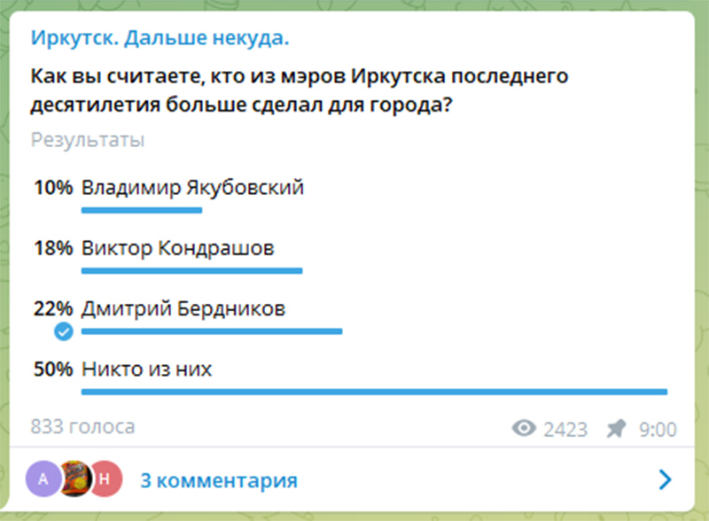 Ровно половина опрошенных Бабром подписчиков телеграм-канала "Иркутск. Дальше некуда" и "Форума Бабра" считают, что ни один из трех предыдущих мэров Иркутска не сделал достаточно для города.