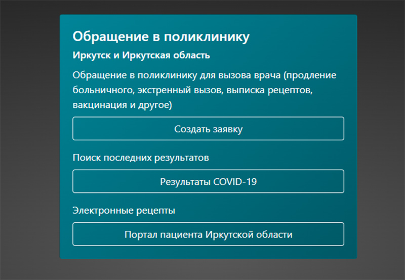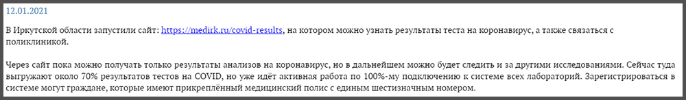 В январе 2021 года Минздрав Иркутской области с помпой запустил сайт medirk.ru, на котором, как заявлялось, можно узнать результаты теста на коронавирус, а также связаться с поликлиникой. Со временем, как обещалось в пресс-релизе, через сайт можно будет следить и за другими исследованиями.