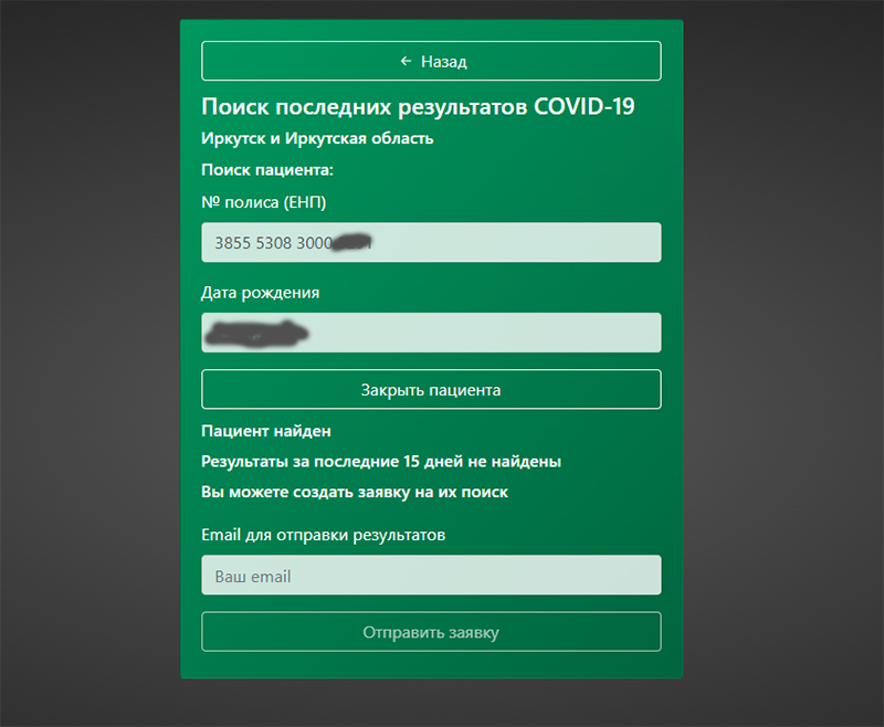 Результат анализа на сайте Medirk можно получить по номеру полиса. Не СНИЛС, как во всем цивилизованном мире. Не по номеру паспорта. По номеру полиса, которого у человека вполне может и не быть. Причем тесты на коронавирус во всех лабораториях сдают именно по паспорту, а не по полису. XXI век, Иркутск, середина земли.