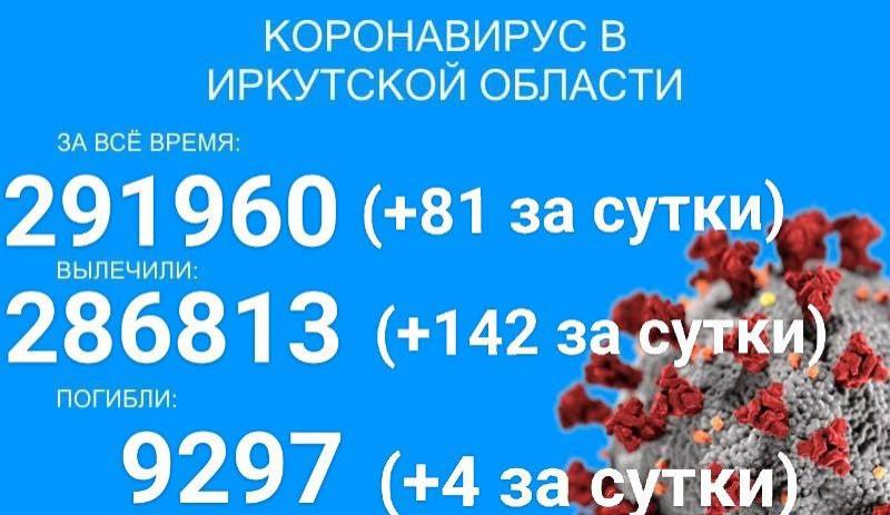 В Иркутской области, по данным на 2 мая, зарегистрировано 291960 официально подтверждённых тестами ПЦР случаев заболевания коронавирусом. За последние сутки заболел 81 человек, сообщает региональный оперштаб.