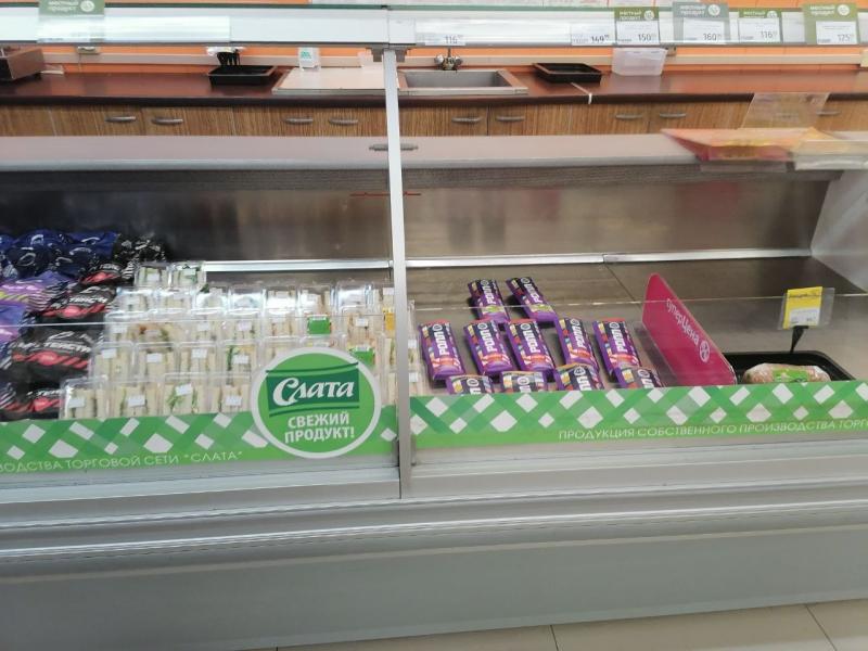 Кроме реально широченных проходов в магазине, по которым двое с тележками могут выбирать продукты в одном проходе с разных рядов, а между ними пройдёт третий покупатель с такой же тележкой, нас поразили ещё две вещи. Первая — постоянно полные полки. Вот реально: мы пришли в районе обеда, когда магазин был полон набежавших студентов. В принципе, прибежали они не зря: погода хорошая, а в этой «Слате» отдел готовых блюд очень большой, ассортимент довольно приятный, и микроволновка на выходе бесплатная стоит.