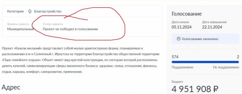 Правда, в «Госуслугах» почему-то указано, что «Проект не победил в голосовании».