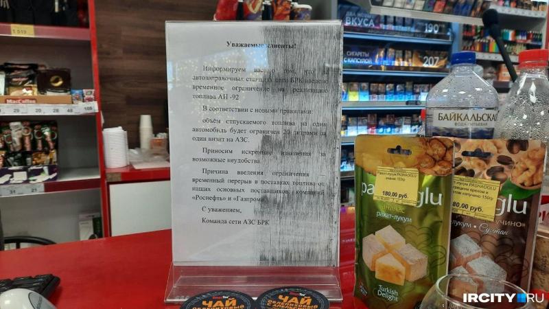 В Иркутске сеть АЗС БРК ограничила продажу бензина Аи-92. Теперь купить этот вид автомобильного топлива можно в объёме не более 20 литров в одни руки, сообщает ИА «ИрСити».