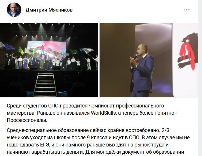 При этом Мясникова почему-то занесло на открытие чемпионата профессионального мастерства (видимо, региональный этап), который призван популяризировать рабочие профессии. Но где рабочие профессии и где Дмитрий Александрович? «Раньше он назывался WorldSkills, а теперь более понятно – "Профессионалы"», – заботливо растолковал название мероприятия Дмитрий Александрович, у которого, видимо, свой исторический взгляд на уровень знаний обладателей среднего специального образования, в том числе в области языков.