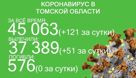 В Томской области за сутки с 13 по 14 октября коронавирус выявили у 121 человека. За все время заболевание зарегистрировано у 45 063 жителей региона. С начала эпидемии излечились 37 389 человек, 51 из них выздоровел в минувшие сутки. В регионе от COVID-19 и его последствий погибли 576 человек.