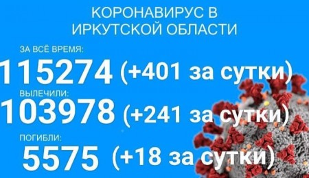 По данным оперштаба Иркутской области, в регионе на утро 15 октября было зарегистрировано 115274 официально подтверждённых тестами ПЦР случая заболевания коронавирусом. За сутки был выявлен 401 новый случай, в том числе 55 детей и двое вахтовиков.