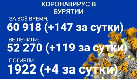 По данным на 17 октября, еще 147 человек в Бурятии заболели COVID-19. Также за сутки 119 пациентов выздоровели, четверо скончались. Об этом сообщает пресс-служба регионального Роспотребнадзора. В настоящее время лечение в стационарах проходят 775 человек с коронавирусом и подозрением на него.