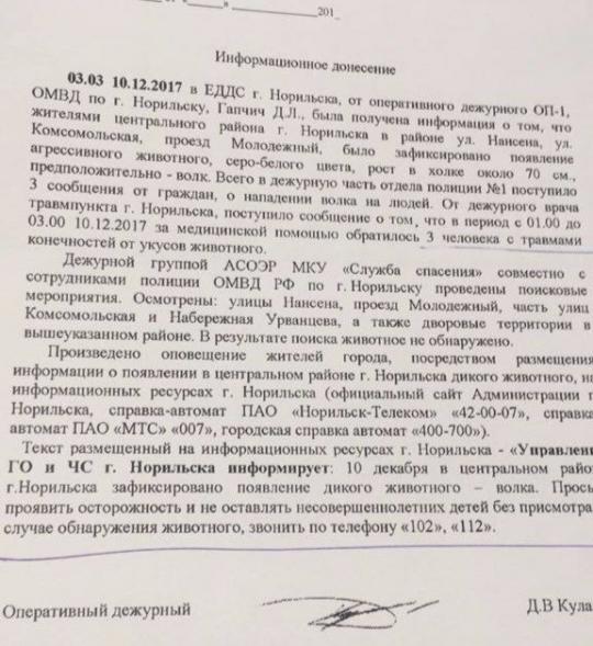 Как бы там ни было, но управление ГО И ЧС Норильска призывает граждан проявлять осторожность до тех пор пока зверь не будет пойман. В случае обнаружения животного рекомендуют звонить по телефону 102, 112.