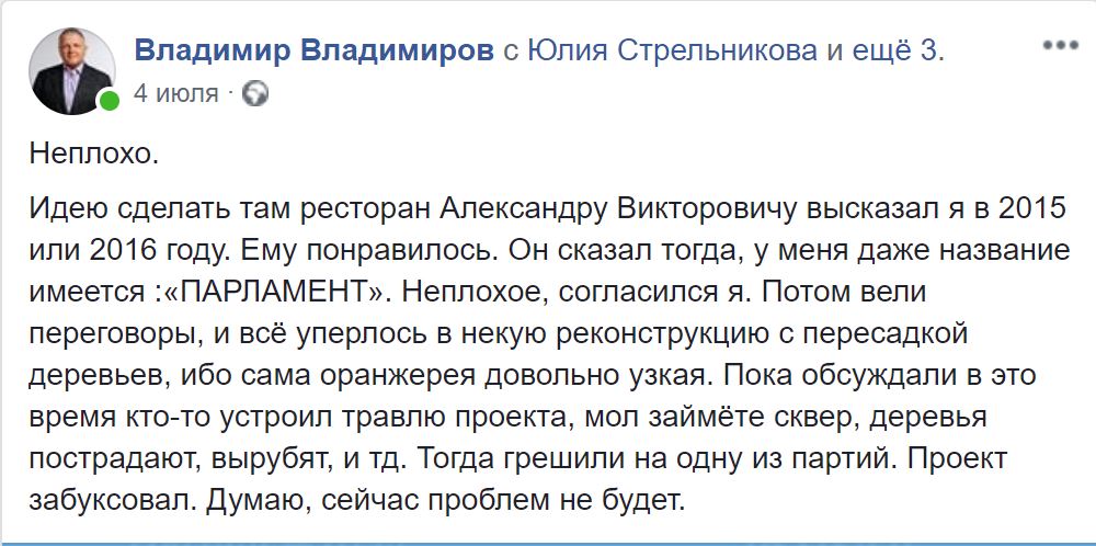 События лета 2019 года показали, что понятия целесообразности и необходимости у губернатора своеобразные. Да и все мы понимаем, что просто так ничего не делается. И подземная парковка шла бы непосредственной связкой к ресторану. А может вместо ресторана на месте оранжереи возник бы небольшой ТРЦ или офисное здание, которым парковка бы явно не помешала.