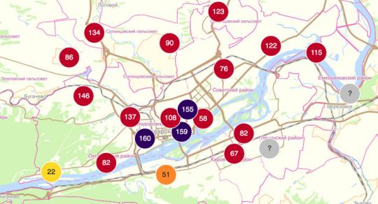 Датчики проекта «Красноярск. Небо» показывают сильное загрязнение по всему городу. Практически такие же данные выдают датчики красноярских учёных. А вот у министерства экологии края карты почти чистые: по их информации, вводить режим НМУ в городе не нужно, так как высокого или экстремально высокого загрязнения воздуха в Красноярске нет.