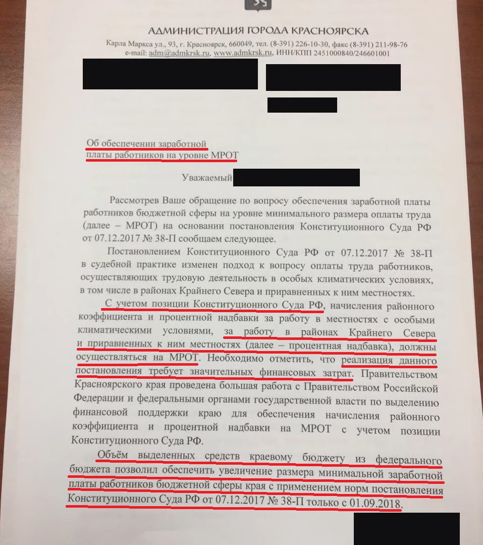 В ответ на запрос о надбавках городская администрация утверждает, что выплаты в соответствии с постановлением Конституционного суда стали возможны только после долгих переговоров на федеральном уровне, когда Красноярскому краю выделили средства на повышение зарплат бюджетников. А до 1 сентября 2018 это было невозможно.