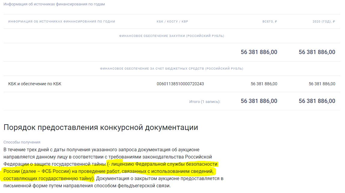 Ещё один интересный момент — аукцион закрытый. Данная закупка составляет некую государственную тайну, и участник обязан иметь лицензию ФСБ на проведение работ с документами, составляющими гостайну. Так что узнать на что и куда были потрачены бюджетные миллионы у простого обывателя нет никаких шансов.