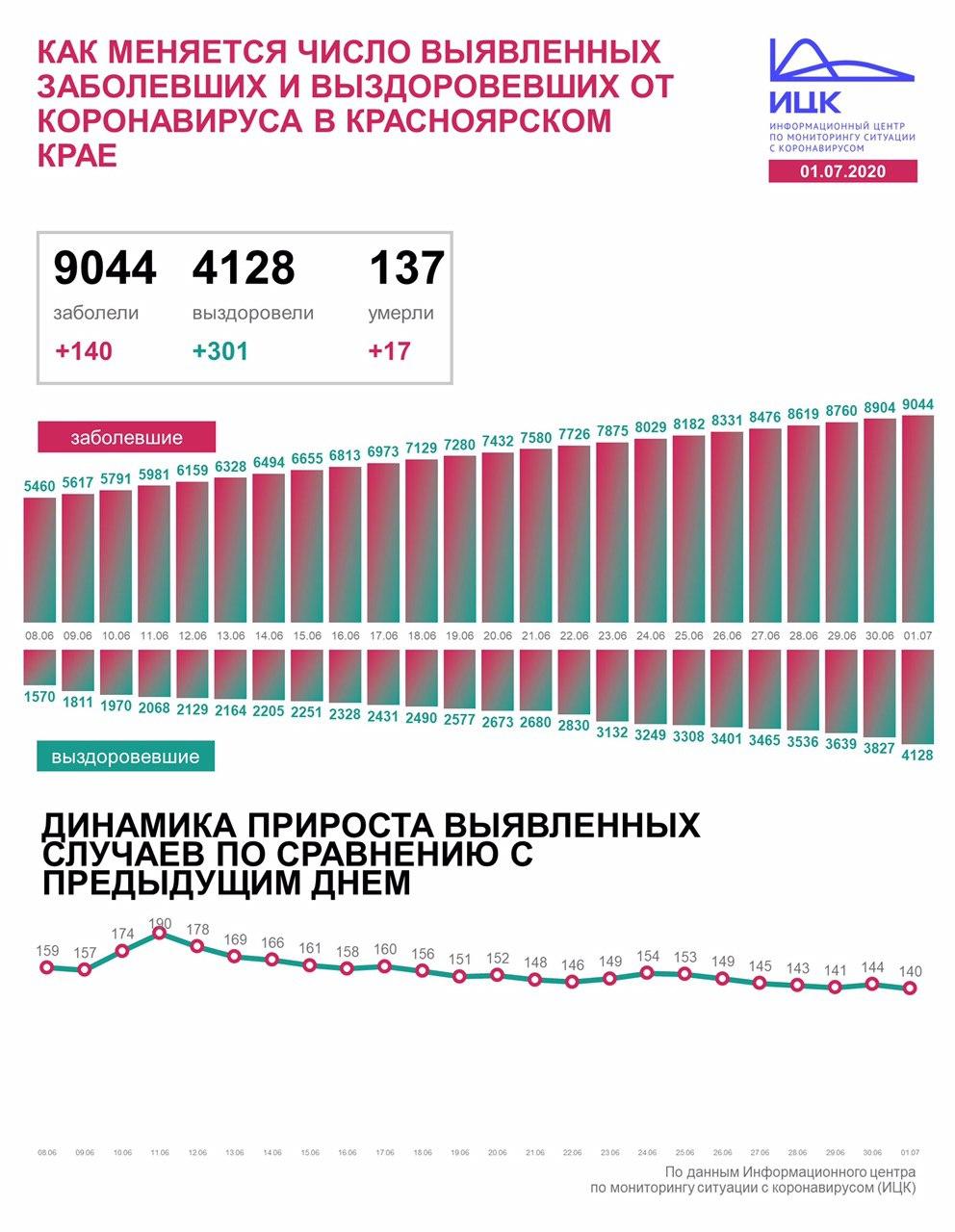 На 1 июля в Красноярском крае зарегистрировали в общей сложности 9044 заболевших коронавирусной инфекцией. 4128 человек полностью вылечились и выписались, еще 137 умерли. Под медицинским наблюдением в настоящее время находятся 1645 человек.