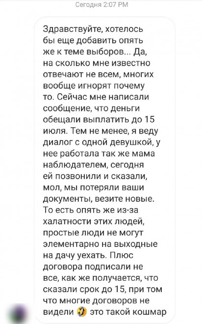 По словам одного из добровольцев, договор обещали подписать в первые дни, начиная с 25 июня. Люди работали с восьми утра до восьми вечера, однако бумаги на руки им так и не выдали, ничего не подписали, денег тоже нет. На все обращения отвечали, что нужно еще подождать, а через некоторое время кураторы и вовсе перестали выходить на связь.