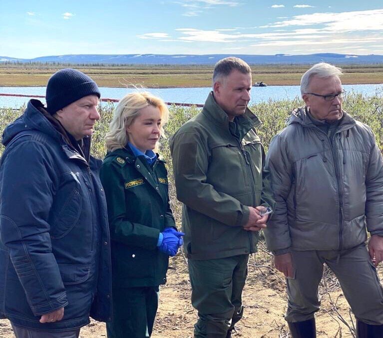 Гендиректор «Норникеля» Владимир Потанин, глава Росприроднадзора Светлана Радионова, губернатор Красноряского края Александр Усс и глава МЧС Евгений Зиничев. На месте разлива топлива под Норильском.