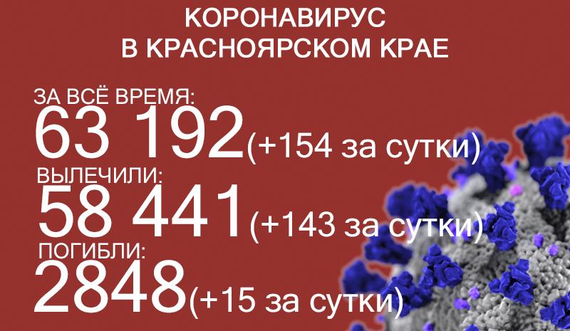 За последние сутки в Красноярском крае выявили ещё 154 заболевших коронавирусом, темп прироста — 0,2%. С начала пандемии COVID-19 заразились 63 192 жителя края. Об этом 4 марта сообщил оперштаб.
