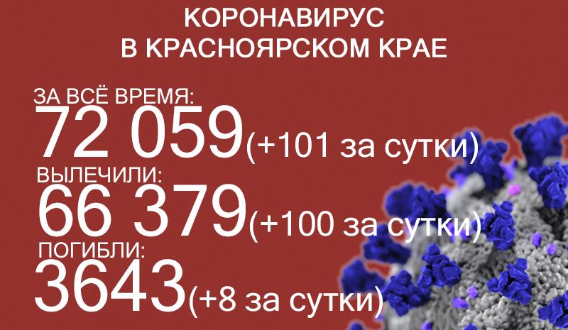 По данным на 16 мая, в Красноярском крае 72 059 случаев заражения коронавирусом. Суточный прирост – 101, темп прироста – 0,1%.