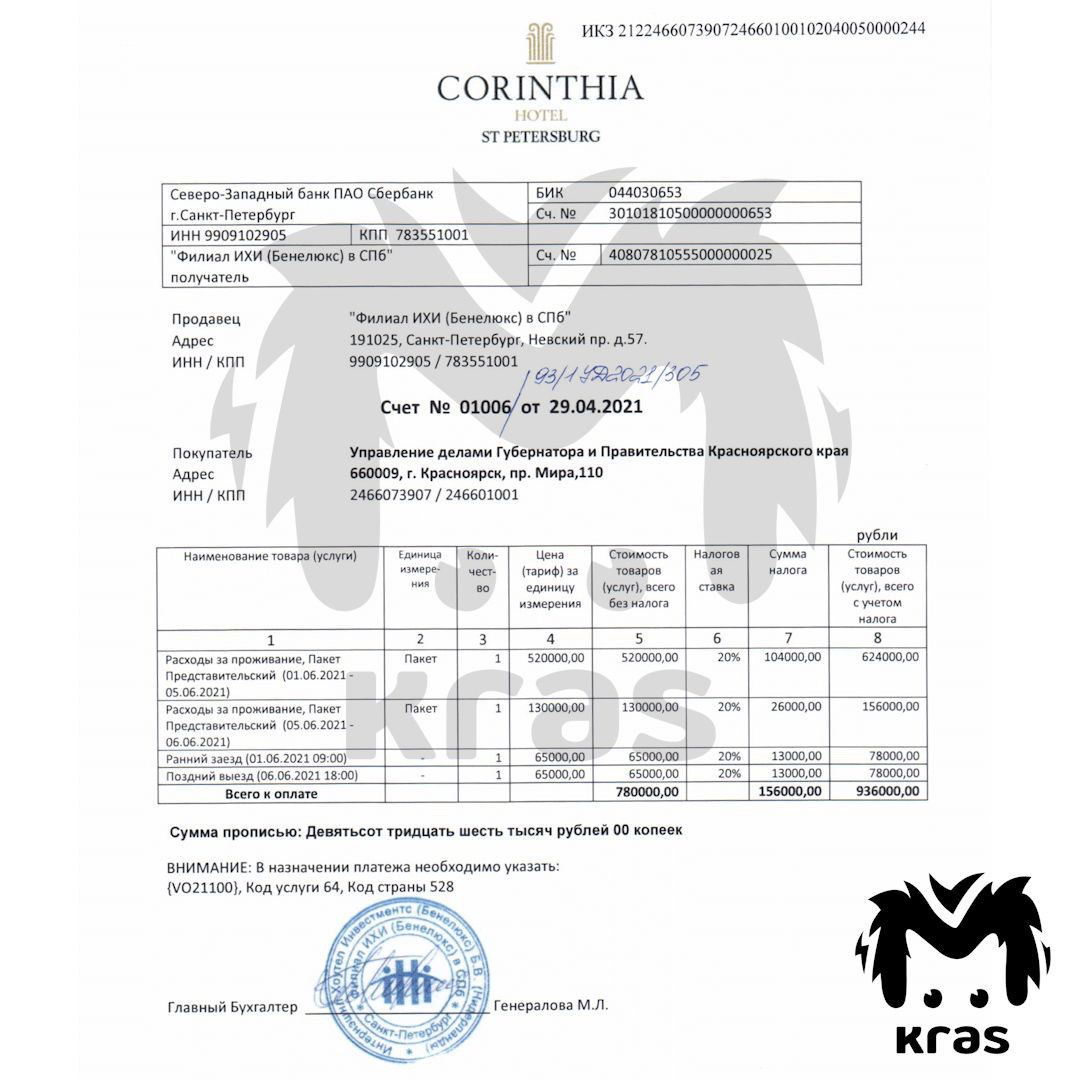 В Санкт-Петербурге скоро пройдёт экономический форум, где Александр Усс будет одним из участников. Для своего проживания чиновник выбрал пятизвёздочный отель Corinthia в центре города. Пять дней в представительском номере обойдутся бюджету края в 936к (вместе с налогом).