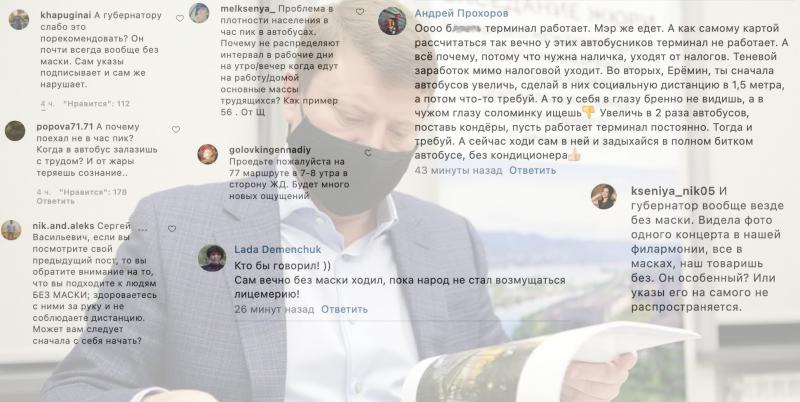 Комментаторы отметили, что сам Ерёмин регулярно подходит к людям без маски, здоровается за руку и не соблюдает дистанцию. Эти же претензии выдвинули и губернатору Уссу. Мэру посоветовали начать работу с себя и губернатора.