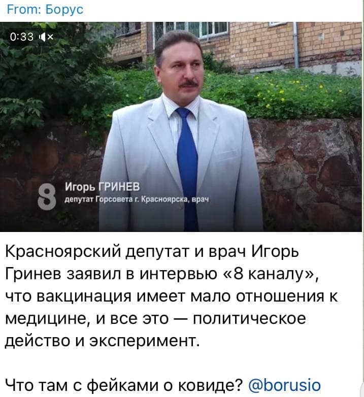 🔼🔼🔼Аля независимый канал в Телеграм «Борус» обеспокоился содержанием сюжетов 8 телеканала. В частности, вчерашним заявлением красноярского депутата и, на минуточку, опытного врача нейрохирурга Игоря Гринева о том, что проводимая обязательная вакцинация от коронавируса имеет мало отношения к медицине, а все это лишь политическое действо и эксперимент. Более того «Борус» задался вопросом о фейках о ковиде. Наверное, блогеру Самусенко, не дано понять, что такое объективная информация в СМИ, когда в материале представляется несколько точек зрения, имеющих право на своё существование. Кстати, если брать в процентном соотношении, то позиция тех, кто За вакцинацию, была представлена в сюжете более объемно. Однако из материала выдернут лишь комментарий Гринева. Интересна, конечно, позиция «независимого» Самусенко, который критикует коллег, хотя коллегой его назвать сложно, ведь «Борус» не относится к СМИ. Да и говорить о независимости «Боруса» язык не поворачивается, ведь не для кого не секрет, как дёшево сегодня продаются блогеры. Вдобавок, видимо, блогеру Витюше не даёт покоя информация от нашего источника о том, как тяжело Самусенко далась служба в армии. Что касается Гринева, то если его обвинить в распространении таких фейков, то он точно выиграет выборы в Заксобрание по Октябрьскому району. А, видимо, этого как раз и не хотели возможные заказчики поста «Боруса».
