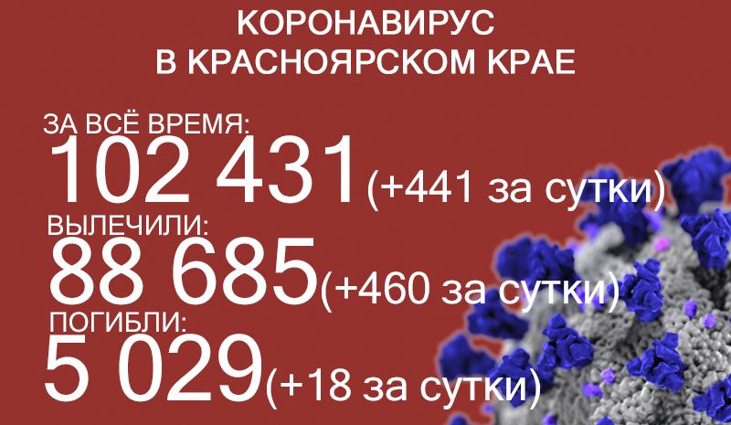 По данным на 25 августа, в Красноярском крае 102 431 случай заражения коронавирусом. Выявили ещё 441 больного, темп прироста – 0,4%.