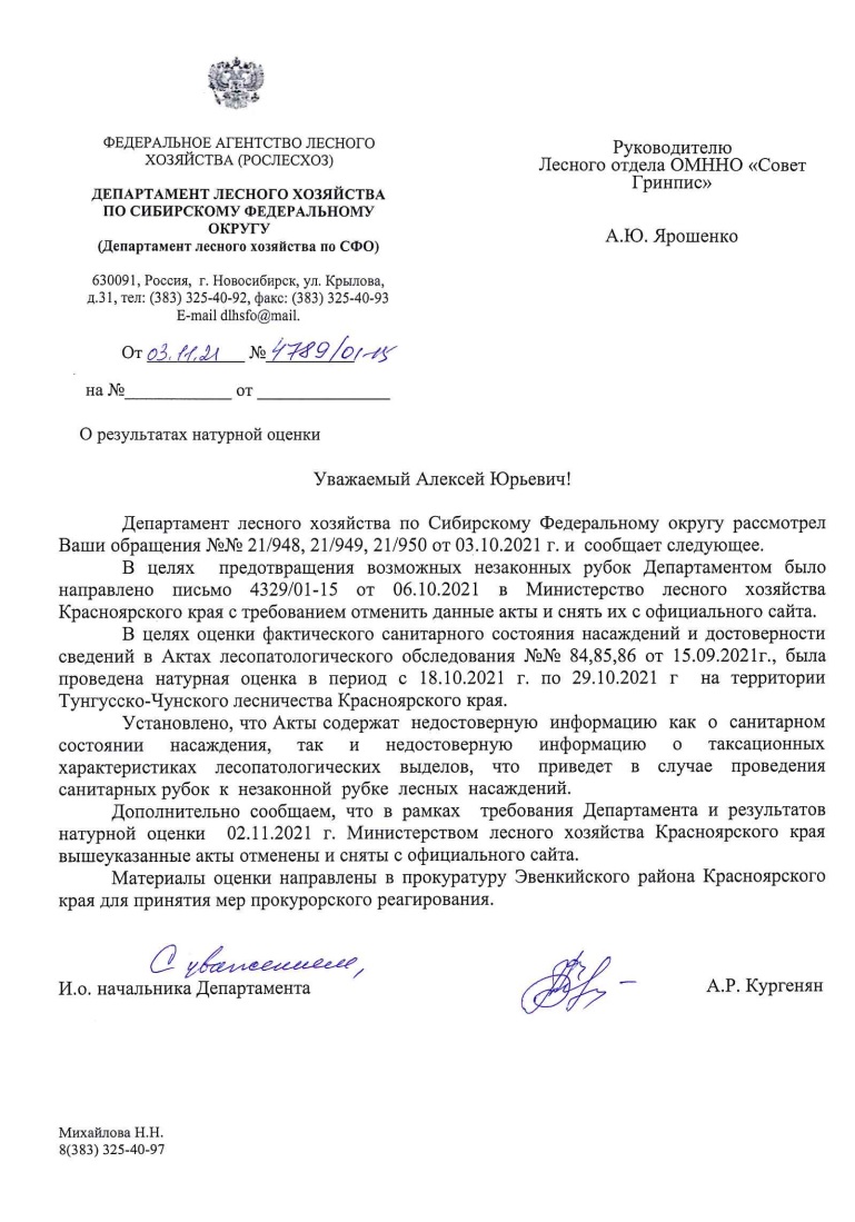 Известно, что материалы проверки Департамента лесного хозяйства по СФО были направлены в прокуратуру Эвенкийского района Красноярского края.