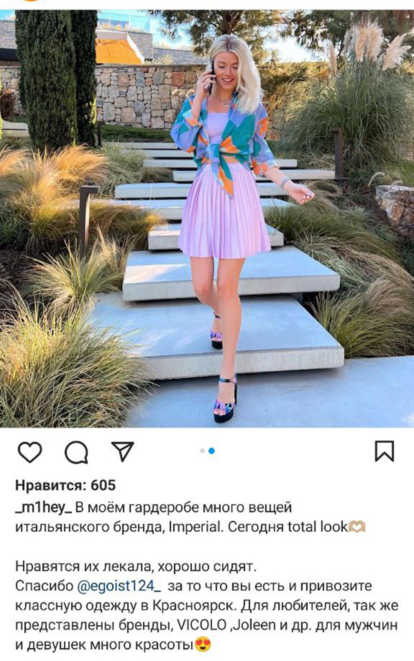 О своих путешествиях и новых платьицах стоимостью в целый истребитель "Жена-2", не стесняясь, рассказывает в запрещенной Роскомнадзором соцсети. Судя по всему, свежеиспеченную супругу миллиардера ничуть не волнуют ни судьба страны, ни происходящие события.