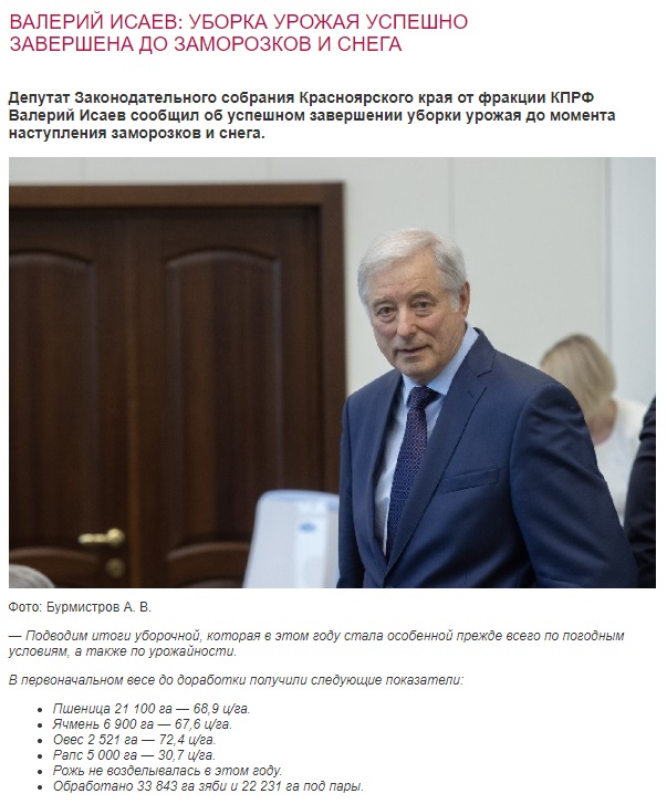 Если верен второй вариант, то Валерий Исаев проявил настоящее благоразумие. Незадолго до заседания аграрного комитета на сайте Заксобрания Красноярского края было опубликовано сообщение, в котором Исаев подвел итоги уборочной кампании в Назаровском районе.