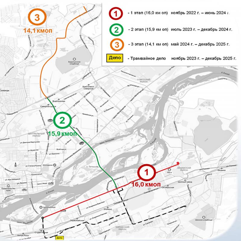 Развитие трамвайной инфраструктуры разбито на три этапа. На первом реконструируют существующую линию по Красрабу от Предмостной площади до КрасТЭЦ. Следом проложат рельсы и контактную сеть на левый берег Красноярска – через Октябрьский мост и улицу Авиаторов, в районы улицы Молокова и 9 Мая до Северного шоссе. На третьем этапе, к концу 2025 года, должна быть построена ветка в Солнечный, которая пройдет за кладбищем Бадалык до проспекта 60 лет Образования СССР и далее до разворотного кольца на Молодежном проспекте.
