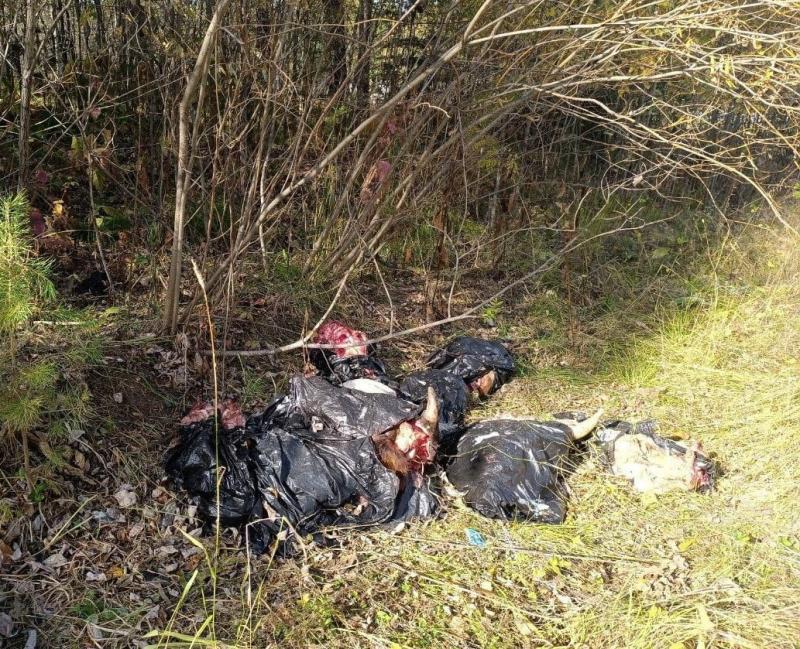 Ещё одну свалку из останков животных обнаружили в районе СНТ «Кускун». Коровьи головы и другие части крупного рогатого скота в мешках выбросили неподалёку от дачных участков.