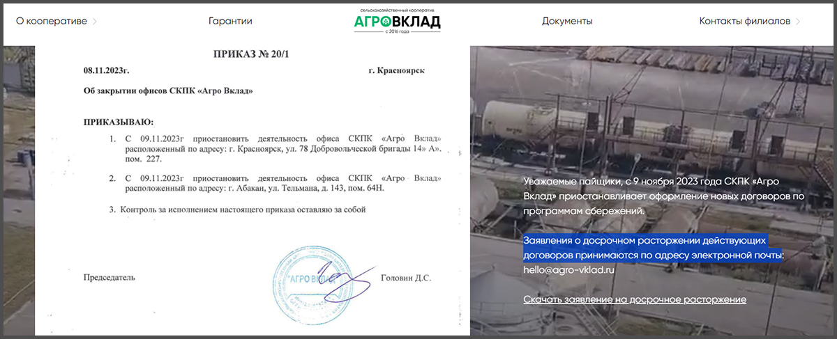 Сразу после исчезновения Гольдмана панику подняли сотни вкладчиков кооператива «Агро Вклад», напрямую связанного с холдингом. Вкладчики остались без выплаты дивидендов, на офисе кооператива одиноко висело объявление о прекращении выплат.