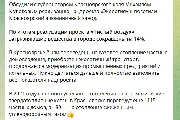 Недавно Красноярск с рабочим визитом посетила заместитель председателя правительства РФ Виктория Абрамченко. Она заявила, что количество загрязняющих веществ в воздухе сократилось на 14%. Такие выводы зампред сделала после обсуждения экологической ситуации с губернатором Михаилом Котюковым.