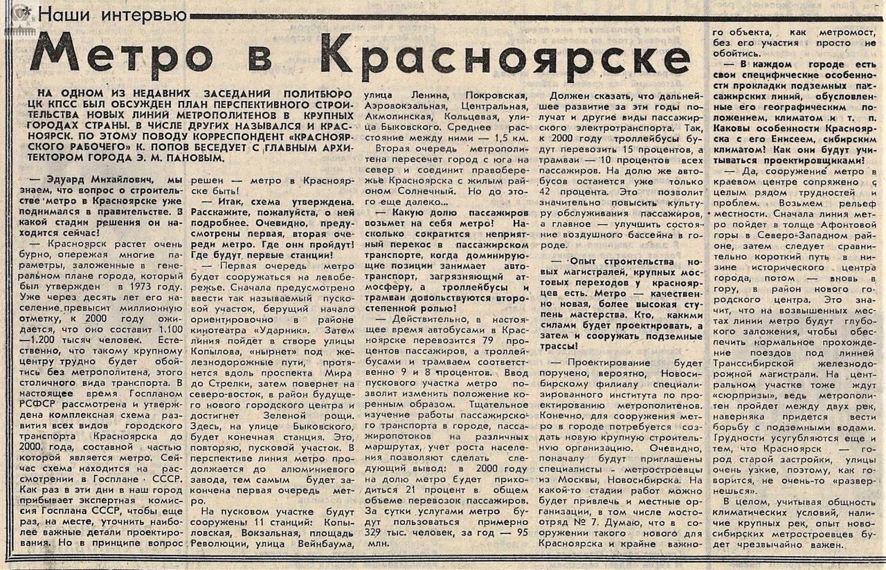 Интервью с главным архитектором Красноярска Э. М. Пановым по поводу строительства метро в городе, опубликованное в газете «Красноярский рабочий».