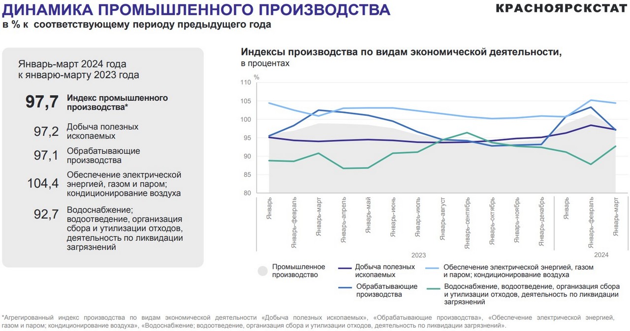 В Красноярском крае зафиксировано замедление темпов роста промышленного производства. По данным Красноярскстата, за первый квартал 2024 года индекс промпроизводства в регионе составил 97,7% по сравнению с аналогичным периодом прошлого года.