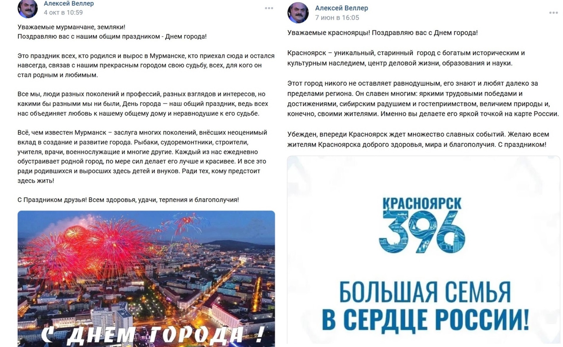 В октябре Алексей Веллер поздравил мурманчан с днем города. Справедливости ради, в июне Веллер не обошел стороной и жителей Красноярска, поздравив с днем города. Однако, сравнивая открытки от депутата, невооруженным глазом видно, что душой и телом, не считая многочисленных телеэфиров в Москве, Алексей Веллер принадлежит Мурманску. Красноярск же был и, видимо, останется удобной платформой для продления депутатского мандата, посещать которую достаточно и раз в год.