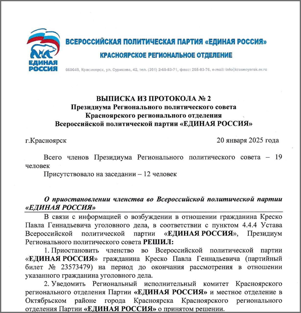 Членство депутата Красноярского городского совета Павла Креско в партии «Единая Россия» приостановлено до окончания рассмотрения уголовного дела, возбуждённого в его отношении. Об этом сообщили представители партии. Формально Креско продолжает оставаться депутатом горсовета, хотя на прошлой неделе он подал заявление о добровольном сложении полномочий.