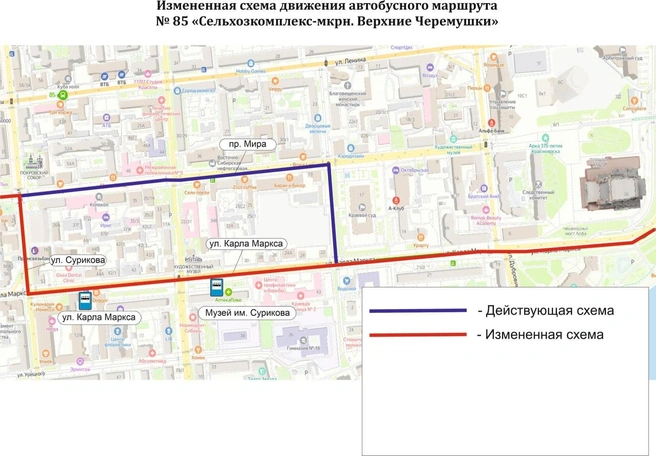 Теперь автобус сворачивает с проспекта Мира на улицу Карла Маркса и не заезжает на остановку «улица Парижской Коммуны». Вместо неё предусмотрены две другие остановки — «улица Карла Маркса» и «Музей Сурикова».