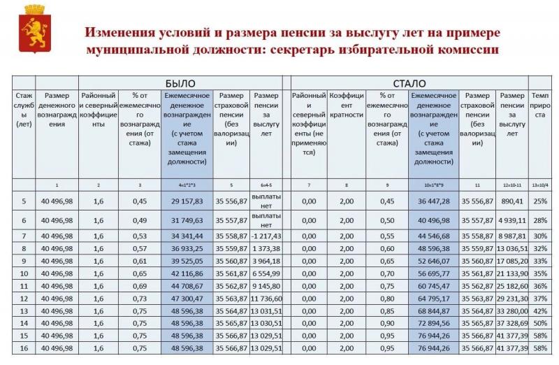 Депутат Павел Мокин опубликовал в соцсетях таблицу с расчетами. В ней, например, приведены данные для секретаря избирательной комиссии с зарплатой 40 тысяч рублей. Его пенсия за пять лет службы сейчас составляет 29,1 тысячи рублей, а после изменений увеличится до 36,5 тысячи рублей. При стаже 15 лет пенсия вырастет с 48,6 тысячи до 79,9 тысячи рублей, что соответствует росту на 58%.