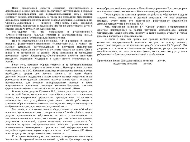По мнению Немировского, депутат Законодательного собрания края Ирина Иванова, кроме того, что является супругой Головкина, тоже участвует в травле «Ориона». А экс-сотрудник А.Л. Черкашин, якобы мог предоставить Головкину информацию о внутренних делах «Орион Телекома».