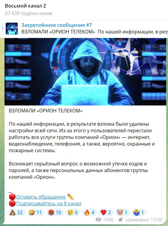 Есть и ещё один немаловажный факт. Публикация о «взломе и уничтожении» инфраструктуры «Ориона» появилась у «8 канала» на шесть часов раньше, чем у организации, которая взяла на себя ответственность за атаку. По информации «Ориона», компанию атаковала хакерская группировка.