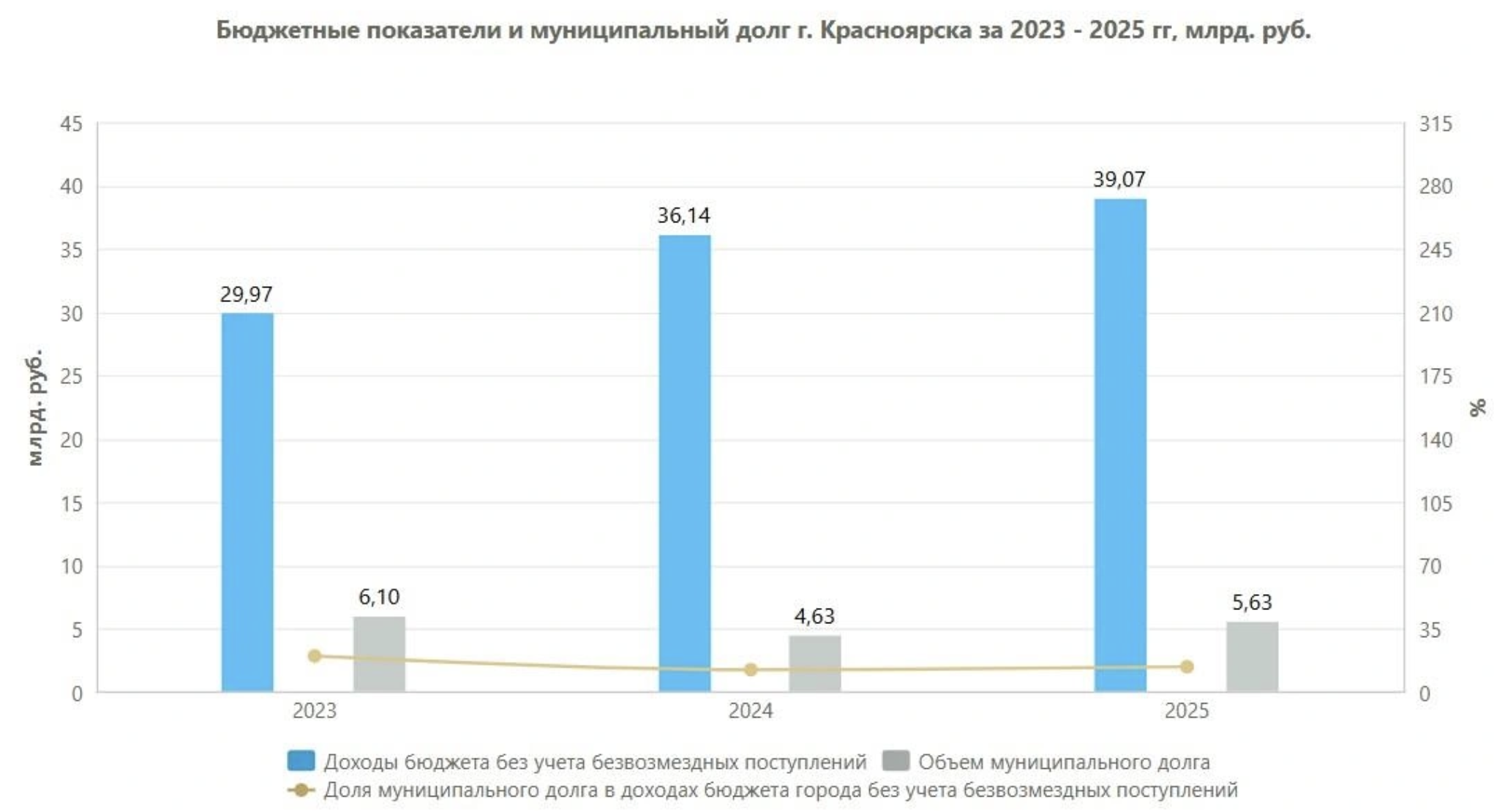 По данным портала «Открытый бюджет Красноярска», в 2025 году размер муниципального долга достиг 5 миллиардов 634 миллионов рублей. Этот показатель выше, чем в 2024 году, но ниже уровня 2023 года.