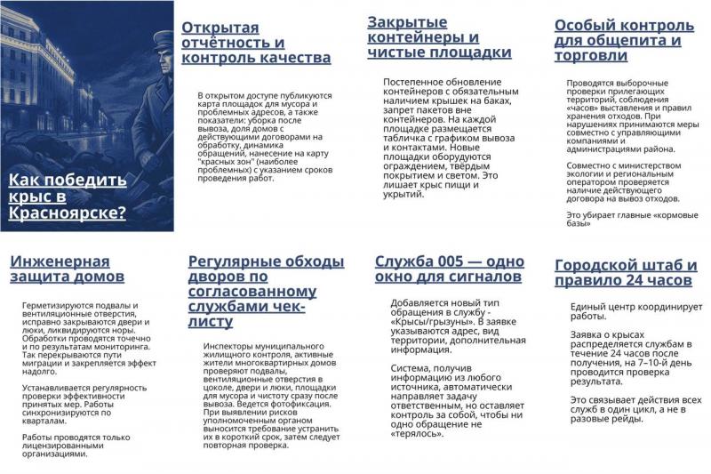 Если верить карточкам, которые распространяет депутат Илья Зайцев, Красноярск стоит буквально в шаге от победы над крысами. Достаточно включить службу 005, создать штаб, завести карту проблемных точек, герметизировать подвалы и поставить на каждый контейнер крышку. Карточки рисуют мир, где все службы работают согласованно, управляющие компании соблюдают каждый пункт регламента, контейнерные площадки сияют чистотой, а жители активно помогают власти в борьбе с грызунами.