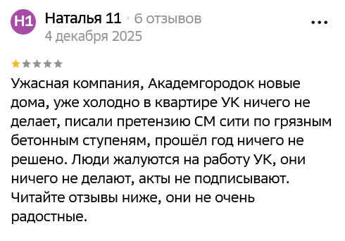 Отзывы свежие. Вот, например, 4 декабря 2025 год, жительница Наталья пишет о том, что компания ужасная, новая квартира в Академгородке холодная, никто с этой проблемой помочь не может.