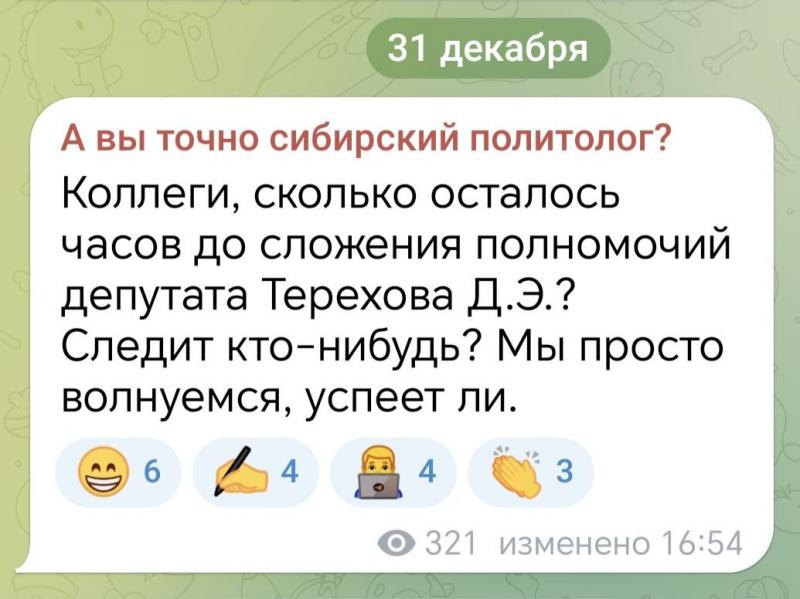 Депутат краевого Заксобрания Денис Терехов, который ранее на красноярском Медиафоруме пообещал сложить полномочия до конца года, естественно, никакие полномочия не сложил. Ждали всем телеграмом.