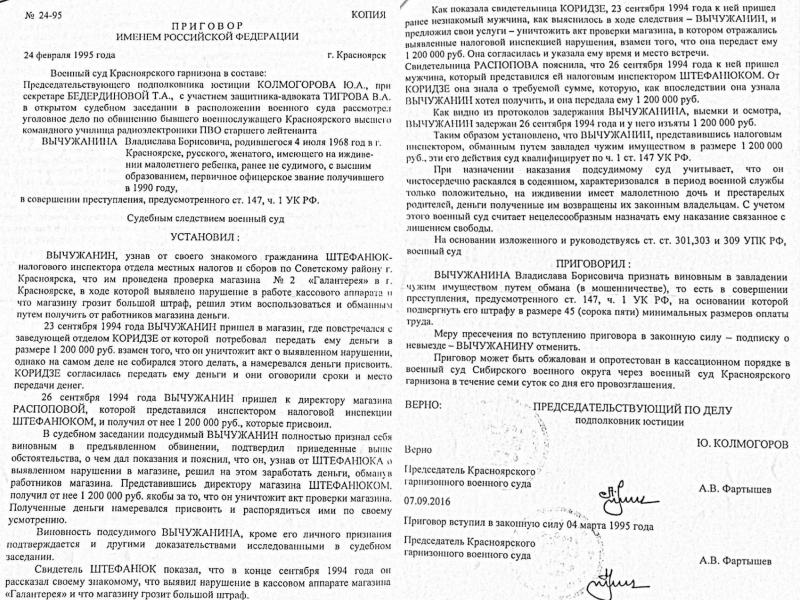 Против афериста давали показания и подставленный им налоговик, и директор магазина. А сам Вычужанин чистосердечно каялся: на иждивении малолетняя дочь и престарелые родители, полученные обманом деньги готов возвратить. В процессе суда миллион с лишним вернулся законным владельцам, а мошенник отделался всего лишь штрафом в размере 45 МРОТ.