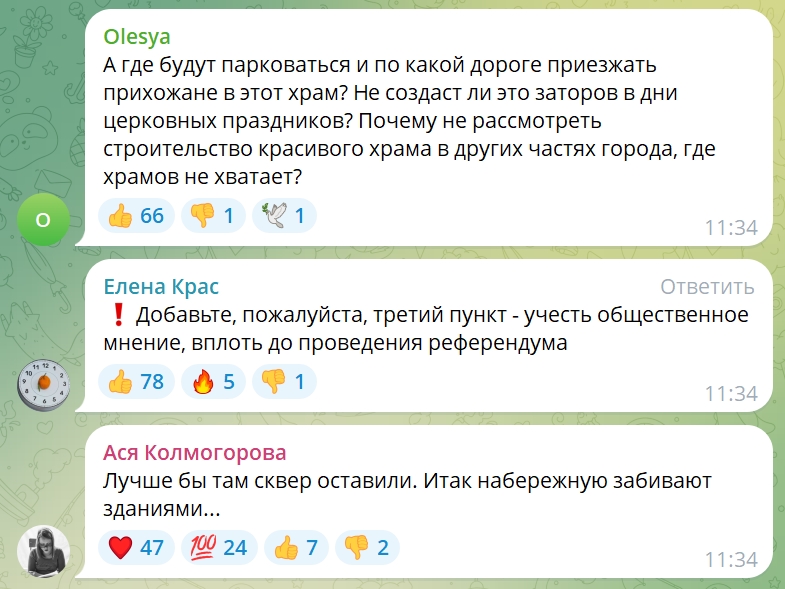 К посту мэра в телеграм-канале уже больше 470 комментариев. Обсуждения строительства храма проходят бурно. Кто-то против, чтобы храм строили на набережной, ведь это место отдыха. К тому же архитектура собора слишком отличается от строений вокруг. Кто-то просит перенести строительство в другое место. А кто-то в принципе против строительства собора, ведь в Красноярске и так достаточно храмов и церквей. Ещё бытует мнение, что строительство собора на пожертвования в настоящее время не самое лучшее решение, потому оно может стать долгостроем.