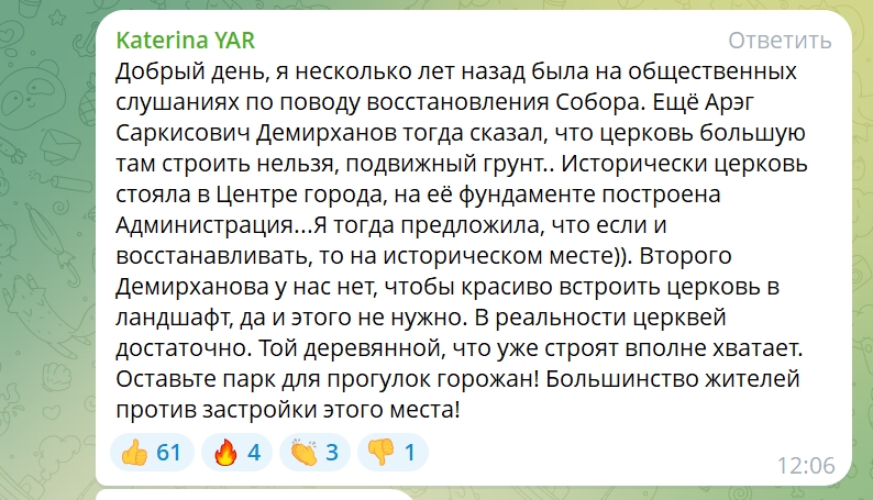 Исследования говорят о том, что участок может не выдержать строительства такого большого собора. Кстати, в комментариях к посту мэра жители упоминают и об этом.