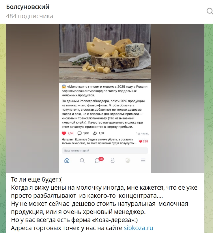 Недавно в телеграм-канале появился пост, который вызвал у нас, мягко говоря, недоумение. Владелец фермы, сетуя на высокие цены на молочку и, предполагая, что если только «разбалтывают» из концентрата, она может быть дешевой, тут же предлагает свою продукцию, намекая на ее исключительную натуральность и качество.