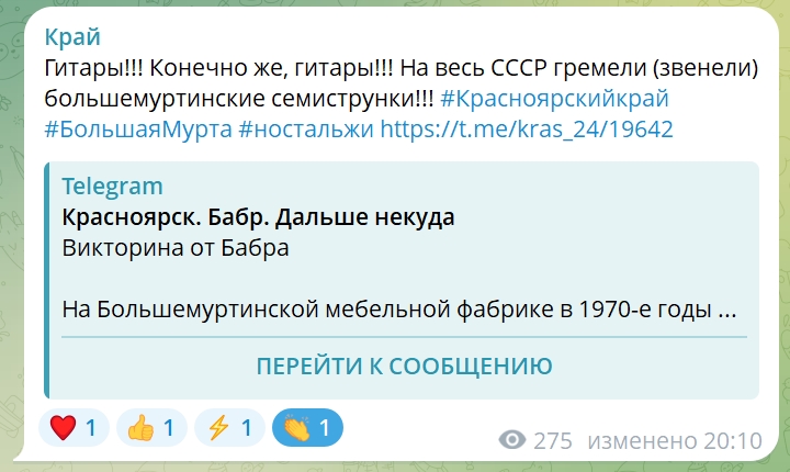 Посёлок Большая Мурта расположен в ста километрах от Красноярска. Именно там в конце 1970-х годов изготавливали популярный на тот момент музыкальный инструмент – семиструнные гитары. По этой теме Бабр в прошлые выходные проводил викторину в своём телеграм-канале Красноярск. Бабр. Дальше некуда (@kras_24). Большинство её участников знали правильный ответ.