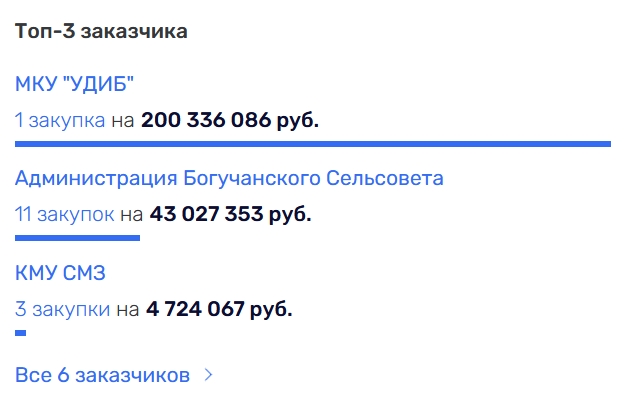 ООО «Енисейгрупп» (ОГРН 1192468003441), руководитель и учредитель Абраам Ерицян. УДИБ также является лидером среди заказчиков.